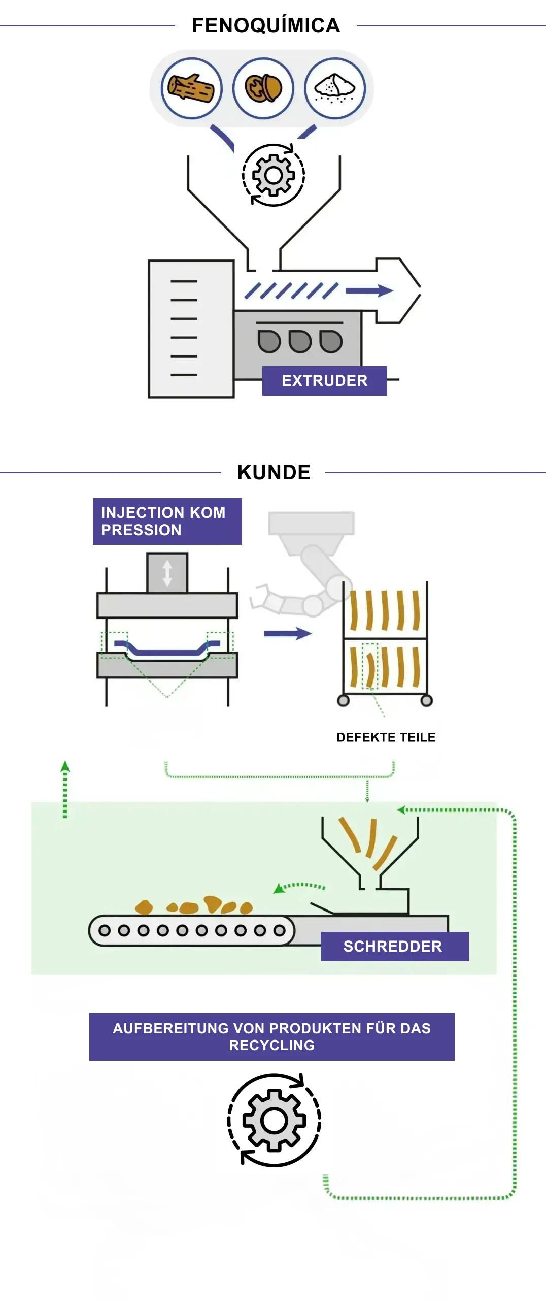 Sobald dieses Material in Fenoquímica angekommen ist, wird es wiederverarbeitet und in den Produktionszyklus für die Herstellung neuer Materialien integriert. Auf diese Weise und mit einer umfassenden Vision des Lebenszyklus gewinnen wir Materialien zurück, die sonst zu Abfall werden würden, und verwandeln sie im Rahmen eines Kreislaufwirtschaftsmodells wieder in Konsumgüter.